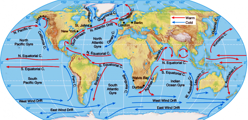 This map shows the ocean gyres and the temperature of the currents in different places in the world. (my apologies for the size of this map, but now you now what to look for on the internet).